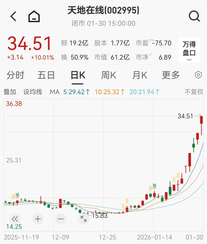事實(shí)上,天地在線自1月19日起,10個(gè)交易日斬獲了6個(gè)漲停板,累計(jì)漲幅達(dá)87.35%,年內(nèi)已漲超108%。