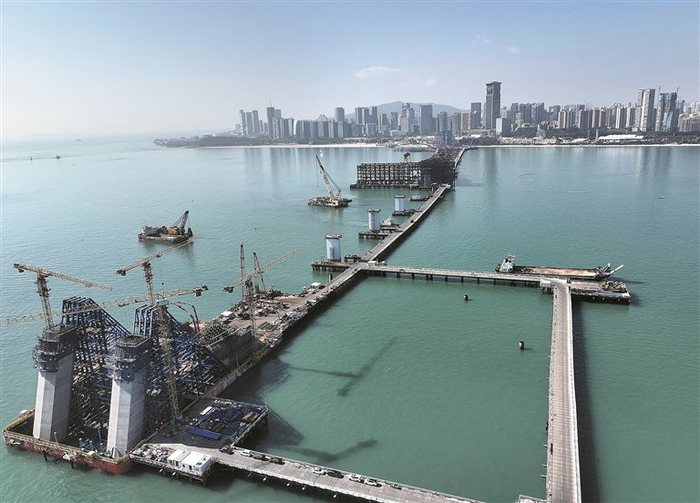 12月1日,廈金大橋關(guān)鍵控制性工程劉五店航道橋主塔完成封頂,標(biāo)志著大橋建設(shè)從“立塔成型”轉(zhuǎn)入“懸索成橋”關(guān)鍵施工階段。圖為12月2日,廈金大橋項(xiàng)目海上橋梁施工現(xiàn)場(chǎng)。??圖片來(lái)源:視覺(jué)中國(guó)