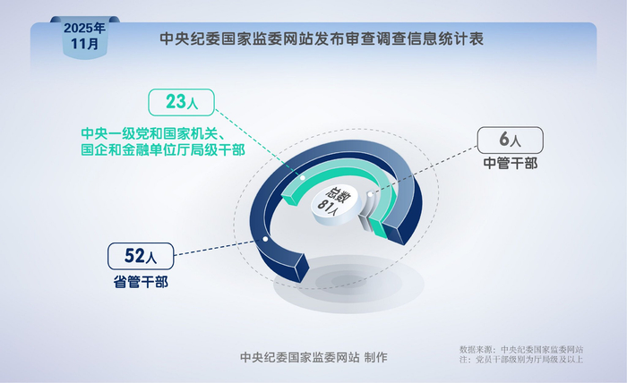 2025年11月,中央紀(jì)委國(guó)家監(jiān)委網(wǎng)站共發(fā)布81條審查調(diào)查信息。其中,中管干部6人,中央一級(jí)黨和國(guó)家機(jī)關(guān)、國(guó)企和金融單位廳局級(jí)干部23人,省管干部52人。