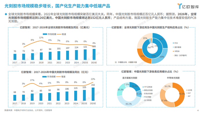 光刻膠是半導體制造的核心材料,直接影響芯片的性能和良率。全球光刻膠市場規(guī)模穩(wěn)步增長,2022 年突破百億美元,預計 2026 年將達到 126 億美元;中國市場 2022 年近百億元,2026 年有望漲到 152 億元。