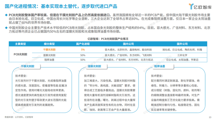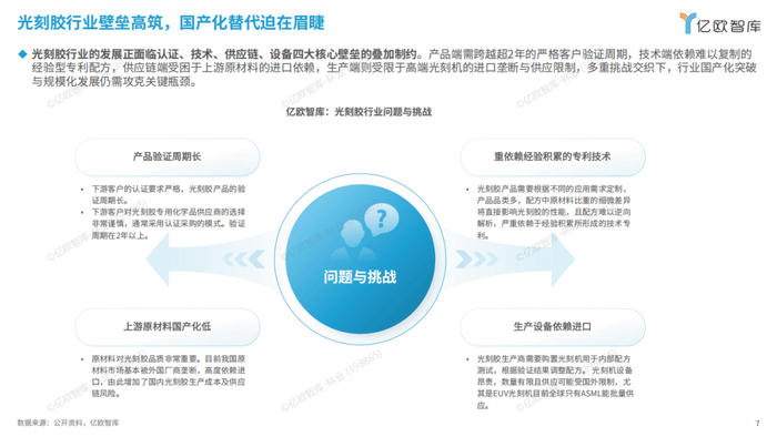 目前光刻膠主要分 PCB、LCD 和半導體三類,國內(nèi)產(chǎn)能大多集中在技術(shù)難度較低的 PCB 光刻膠,占比達 94%,而高端半導體光刻膠還高度依賴進口。行業(yè)面臨多重壁壘,產(chǎn)品驗證周期要兩年以上,核心配方和原材料被國外企業(yè)壟斷,生產(chǎn)設備也大多靠進口。